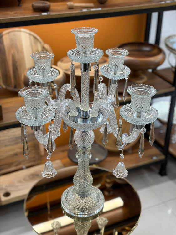 شمعدان کریستالی باکارات 5 شاخه جلوهای خیرهکننده برای دکوراسیون میز پذیرایی، کنسول یا مراسم خاص شما.