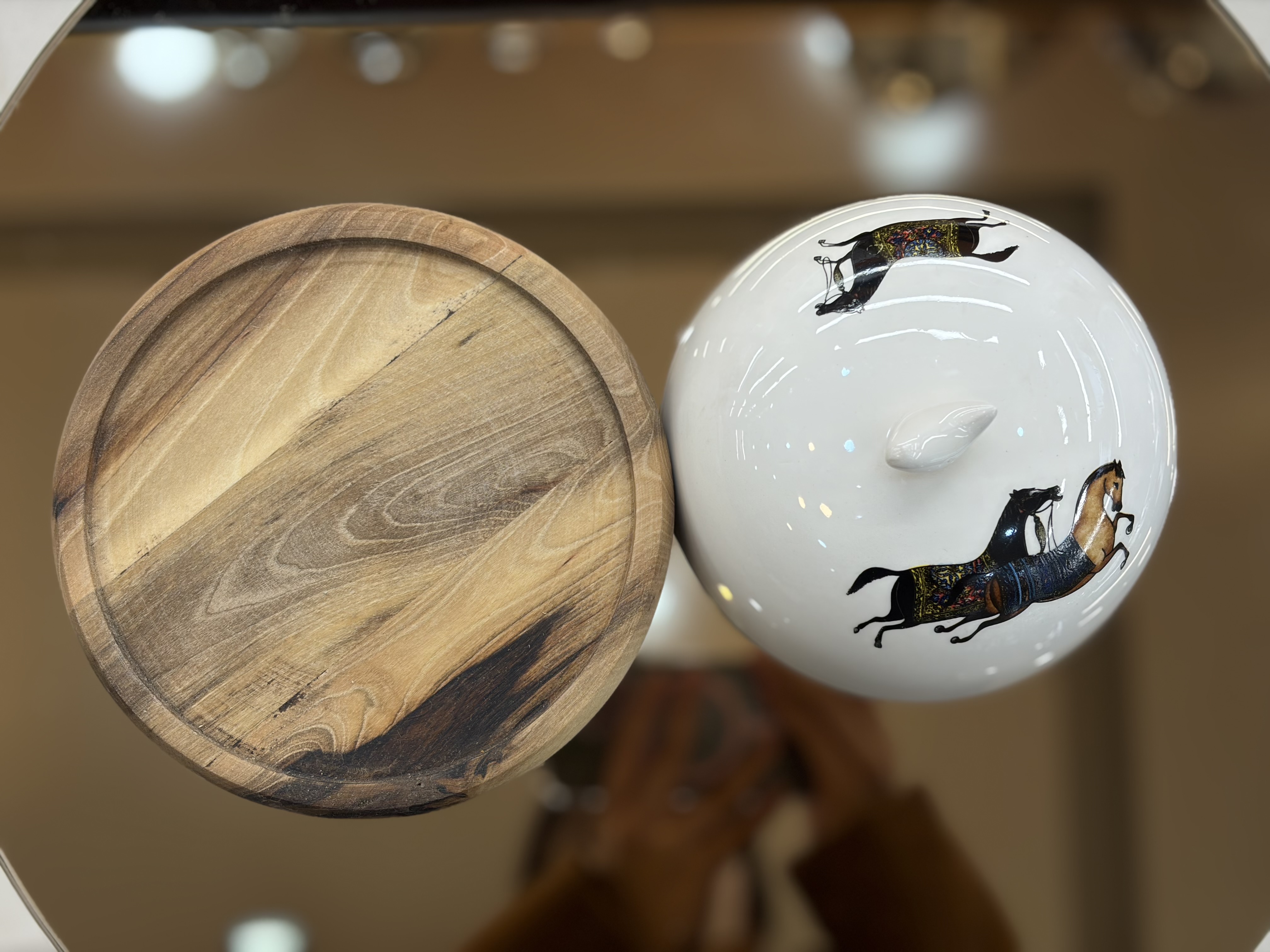 کرهخوری چوبی–سرامیکی با طراحی خاص و نقوش ظریف، مناسب سرو کره یا پنیر.